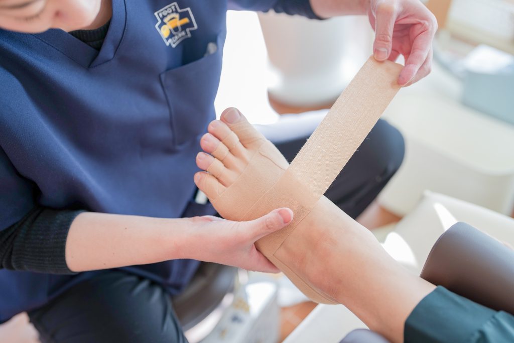 足の状態に合わせて、テープを2重で巻いたり、クッションパッドを使用したり、カスタムをしていきます。