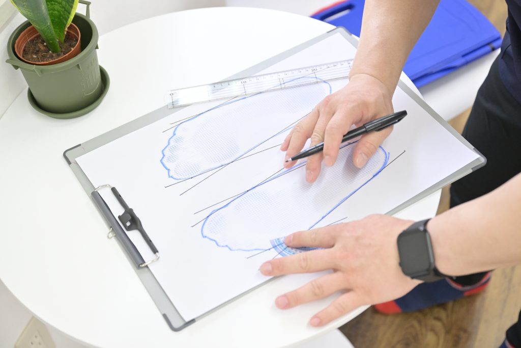 それを元に最初の段階での、外反母趾・内反小趾の角度や、アーチの状態(ロー・ミドル・ハイ)、足圧から重心の位置を確認していきます。