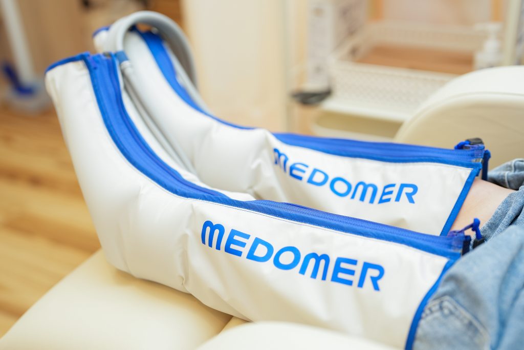 足部のテーピングだけではなく、足部の骨や関節を守る筋肉である下腿部分(すね・ふくらはぎ)に、空気圧のマッサージ器を当ててほぐしていきます。